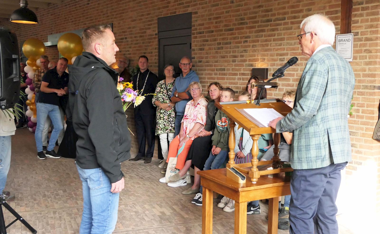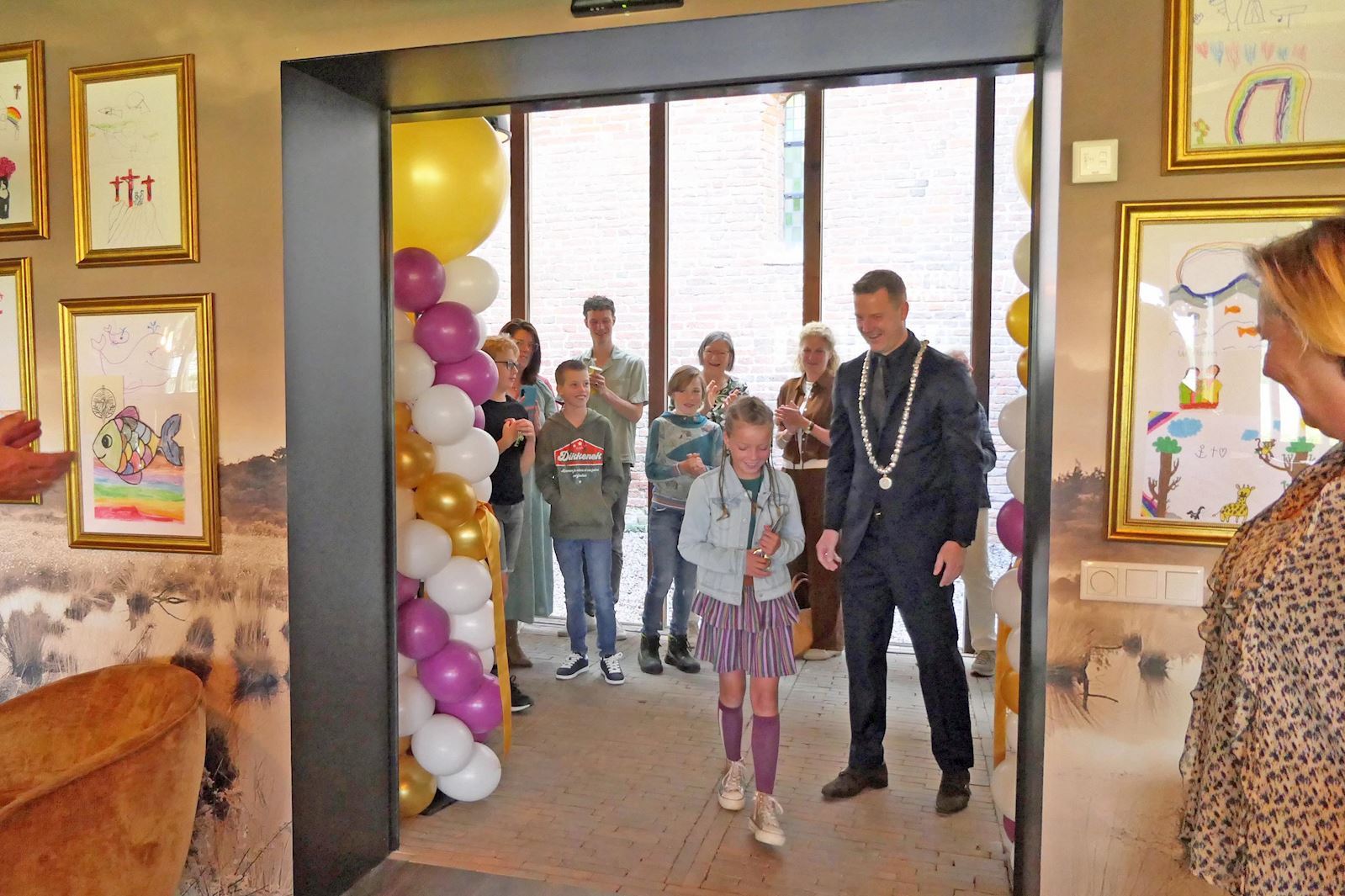 Om 10:30 uur kwamen we samenkwamen in de hal voor een speech van de voorzitter van de kerkenraad, Klaas de Vries. Hij stond stil bij het lange, maar ook energie gevende traject van wensen inventariseren, plannen maken en uiteindelijk uitvoeren. Daarna werden Koos Jurjens en Berthil Smit in de bloemetjes gezet voor hun grote bijdrage aan de verbouwing. Vervolgens nam de burgemeester het woord. Hij benadrukte hoe waardevol het is dat de Nije Wheeme een ontmoetingsplek vormt voor het dorp. Het officiële moment volgde toen Jo-ann Walstra het gouden lint mocht doorknippen en zo de Nije Wheeme feestelijk opende. Via de automatische deur kwamen we binnen in een sfeervolle ruimte waar de bar rijk gevuld was met taartjes. Het was mooi om te zien hoe alle hoekjes van de Nije Wheeme snel gevuld raakten, en dat je ondanks de drukte elkaar toch goed kon verstaan.